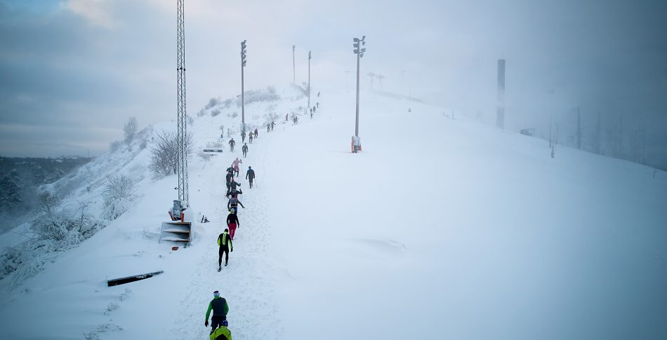 Stämningen är så där förväntansfullt nervös när jag hämtar ut min nummerlapp. Kära återseenden med löparvänner jag bara träffar på tävlingar. Backen är vit och snön är djup. Och djupare ska den bli. Snökanonerna står på fullt blås. Och många är de.