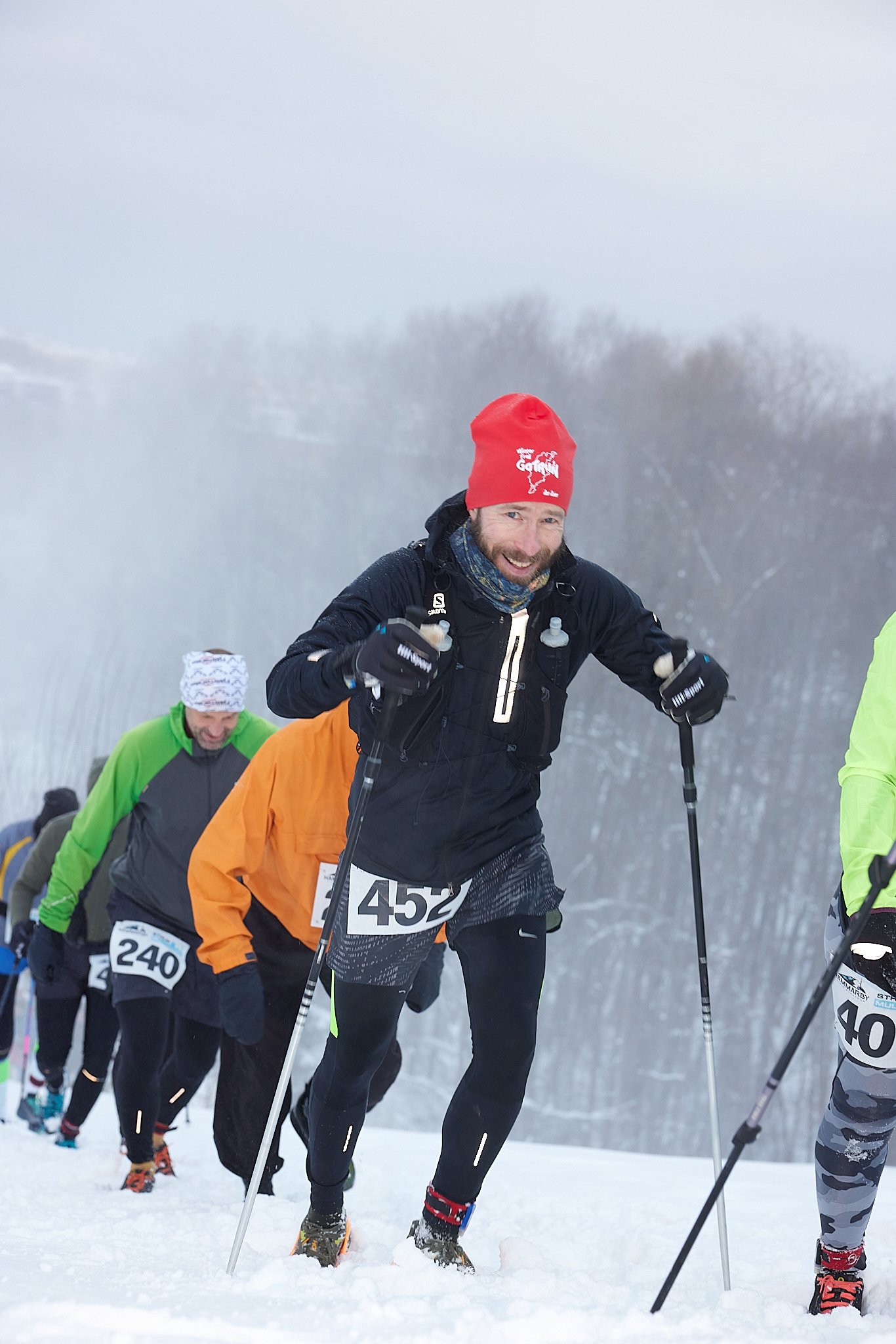 Efter den första knixen går det brant uppför men är ändå gåbart. Några snabba löpare trycker på med stavarna för att skapa distans. Snösörjan under fötterna gör det halt och glidigt. Spikskorna var rätt val men mjölksyran i låren får mig att fundera över hur jag ska klara 21 varv till efter det här.