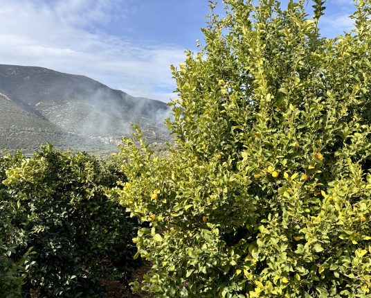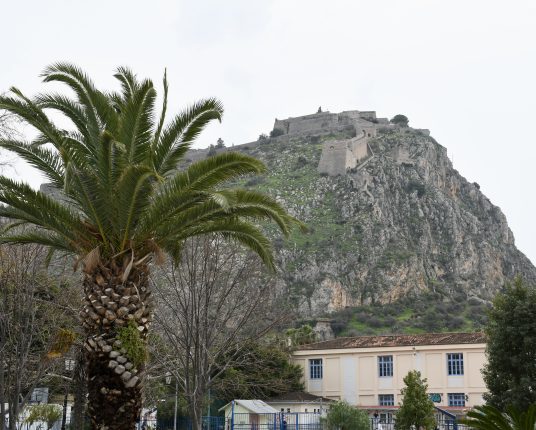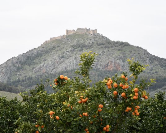 Larissa Castle Argos med apelsinträd i förgrunden. Det är inte bara människor (och katter) som trivs på Peloponnesos. Apelsiner, citroner och oliver samsas också om utrymmet på den vackra halvön.