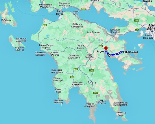 Grekiska halvön Peloponnesos har nu endast brokontakt med fastlandet sedan Korinthkanalen färdigställdes 1893. Dagens etapp gick mellan Epidaurus och Argos.