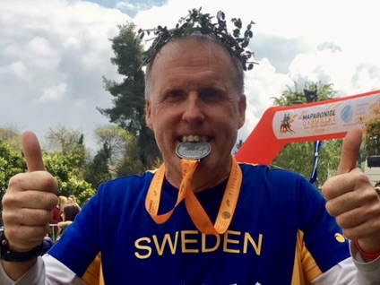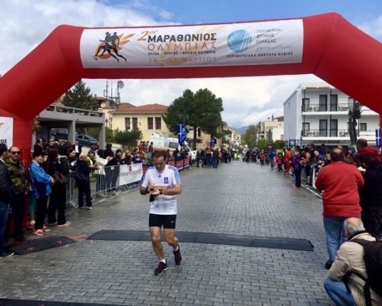 Målgång i Olympia Marathon och då premieras man naturligtvis med en lagerkrans. Just nu är det uppehåll för tävlingen, men förhoppningsvis kommer den tillbaka på agendan i framtiden. Själv sprang jag tävlingen 2016 (bilderna).