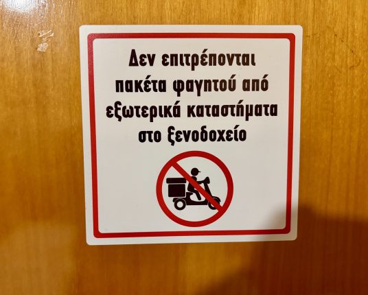 Rena grekiskan. Vad betyder skylten på insidan av mitt hotellrum på tredje våningen? Är det inte tillåtet att köra moped på hotellrummet..?