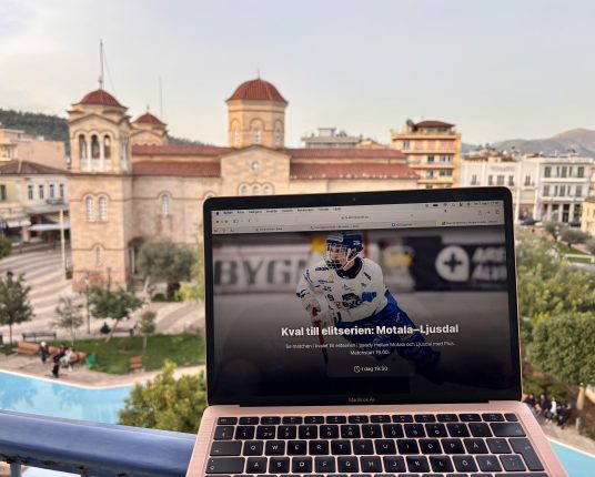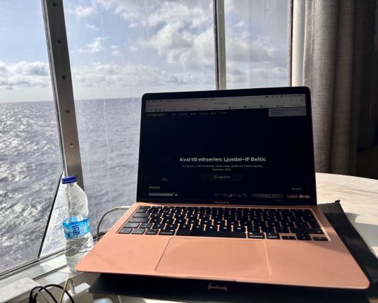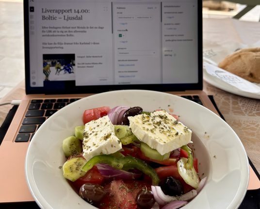 Kvällsjobb för Ljusdals-Posten på färjan som guppade omkring på Adriatiska havet. Liverapportering via modern teknik under elitseriekvalet mellan Ljusdal och Boltic. Hur skulle det gå? Jodå, efter några dramatiska minuter inledningsvis då sändningen ”frös” så fungerade sändningen klockrent. Ljusdal vann dessutom matchen. All inclusive!