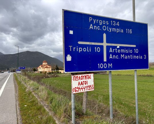 Olympia, slutmålet på ”OS-prologen” genom Grekland, dyker upp på vägskylten för första gången. Men Tripoli..? Det är väl längre än 10 kilometer mellan Grekland och Libyen?