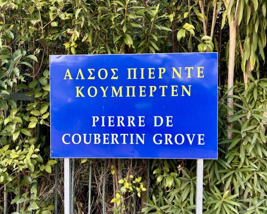Platsen där de moderna olympiska spelens grundare Coubertin har sitt hjärta begravt i Olympia. Resten av kroppen ligger i Lausanne. Baronen spred ut sina grejer, vilken slarver!