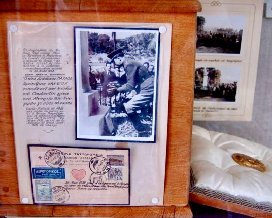 Baronens sista önskan var att få sitt hjärta begravt i Olympia och så blev naturligtvis fallet. Hans blodpump transporterades i denna box till den grekiska idyllen. Resten av hans kropp ligger för övrigt begravd i Lausanne i Schweiz där IOK har sitt högkvarter.