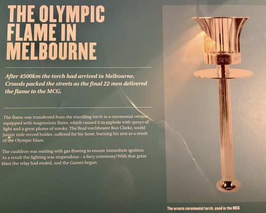 I den olympiska hörnan av museumet finns inte minst den ganska enkla kittel som användes för den olympiska elden 1956. Framför denna vackra pjäs kan man via en video följa den resa som elden gjorde från Olympia till Melbourne Cricket Ground. En resa som faktiskt innehöll en viss dramatik. I Sydney sprang bland annat en veterinärstudent runt med en egen fackla och lurade många, inte minst stadens borgmästare.