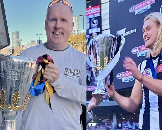 Darcy Moore, lagkapten i Collingwood Magpies, fick till slut lyfta segerbucklan. Men… jag lyfte den före honom!